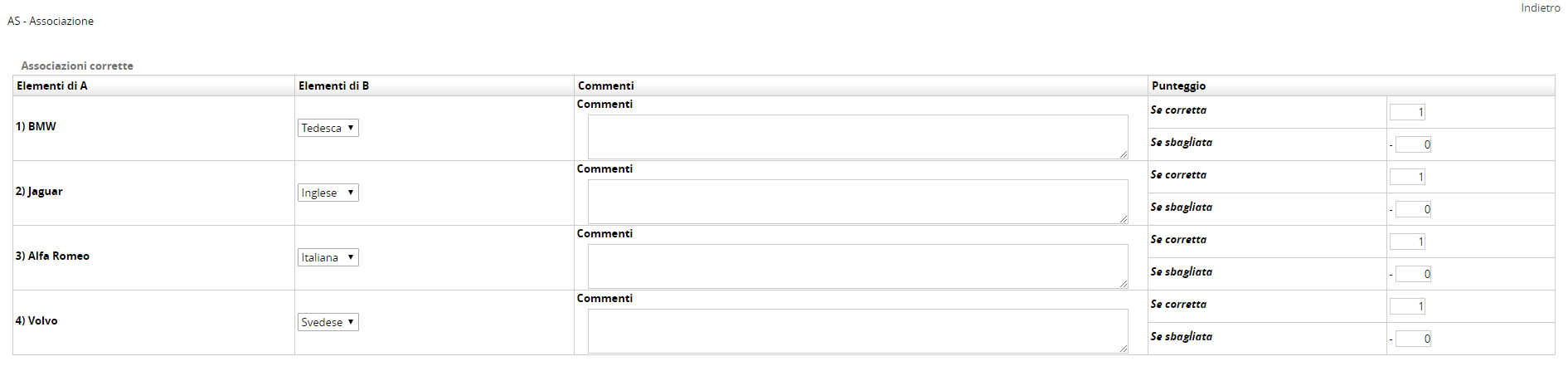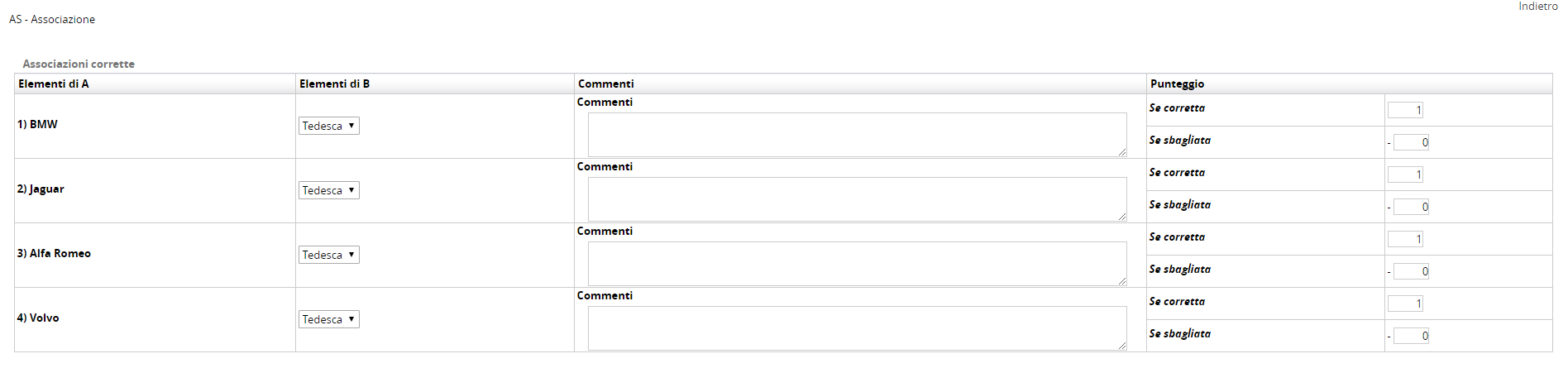 Grazie per la celerissima risposta. In quella fase, come da tuo screenshot, non vi sono errori. L'errore appare dopo, quando si scelgono le associazioni con punteggio (vedere screenshot allegato - 1). Lì, inserite le corrette associazioni e salvate le impostazioni dei punteggi, rientrando, si ritrovano le select "azzerate", senza la corretta risposta scelta, è infatti selezionata la prima voce della select (vedere scrrenshot allegato - 2).