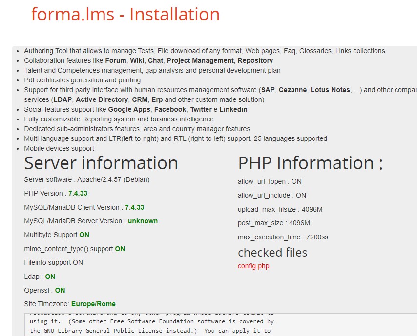 Buongiorno, sto installando forma 4.0.4 su una debian 12 con PHP 7.4.33, apache2 4.57 e mysql /MariaDB 10.11.4 con InnoDB attivo.