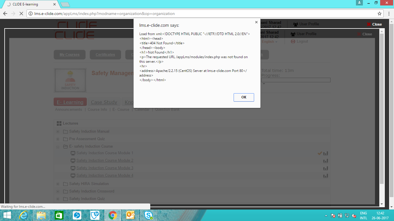 It is opening correctly in my login in my office, but at other location with different user login for the first time, it shows this error. We got this error for the first time, before this it was running fine and some 20 users have completed this course.