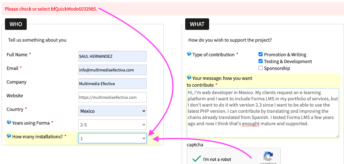 I try to send the form for apply to be a contributor, but I cannot get it because there is an error that does not allow me to advance. In the item "How many installations?" Don't detect that I already check it.