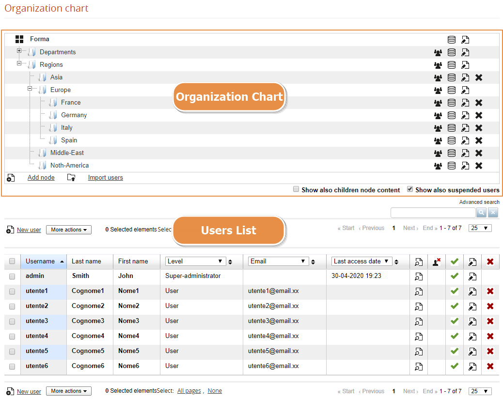- Organization Chart: this tree-like structure of folders (nodes) represents the core logic for users organization, and will be used by most of the other features of the LMS. to simplify user's selection and automate massive operations.